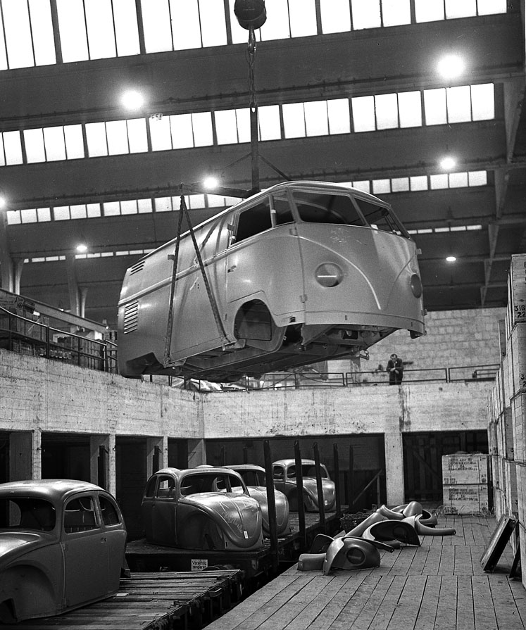 Als alles begann: eine der frühen Bulli-Karossen schwebt durch die Montagehalle.